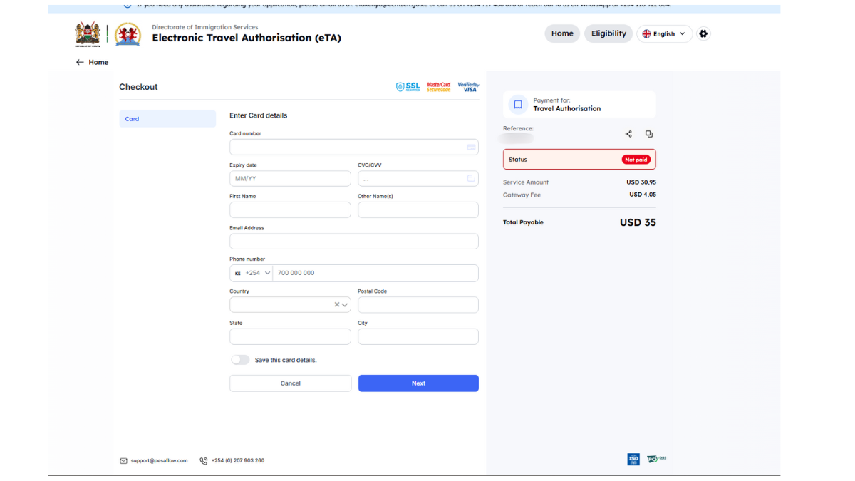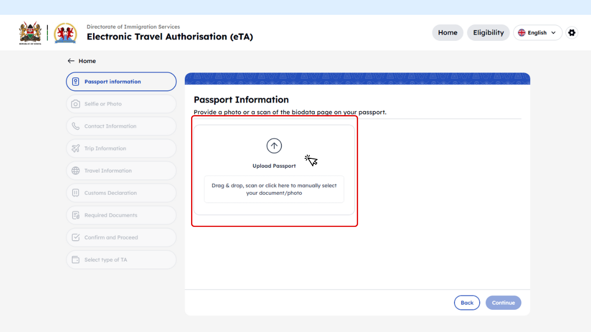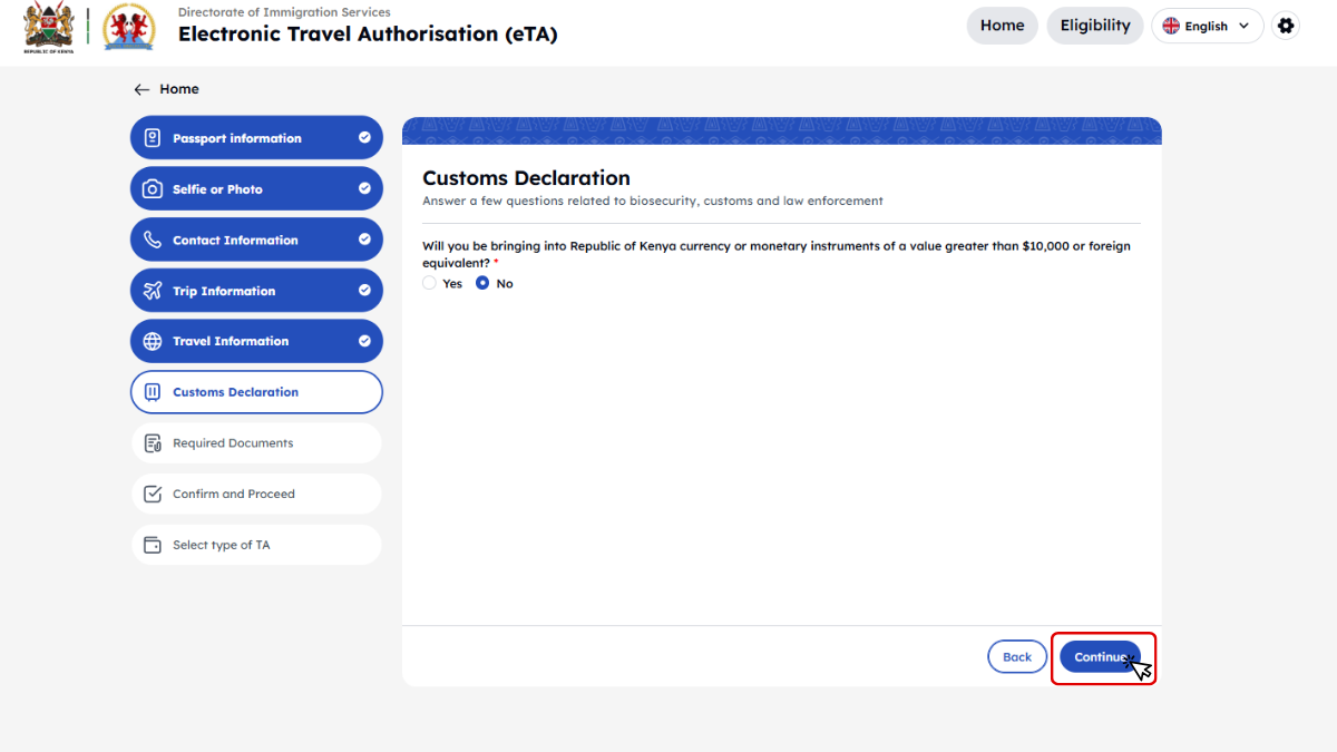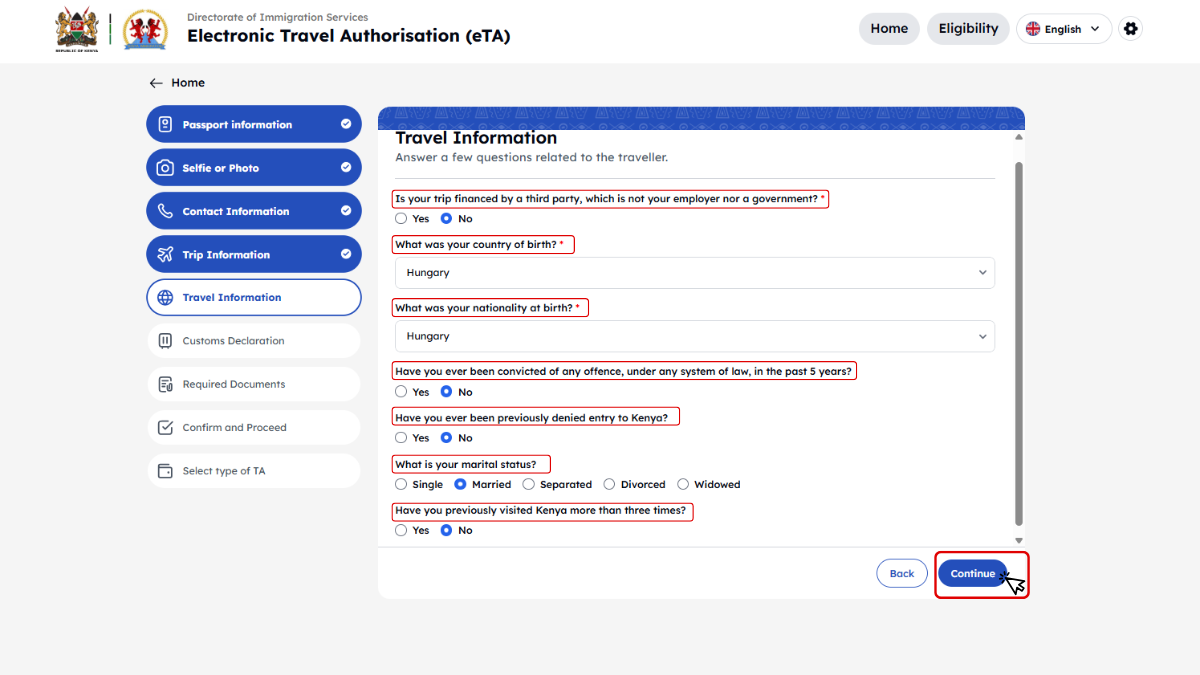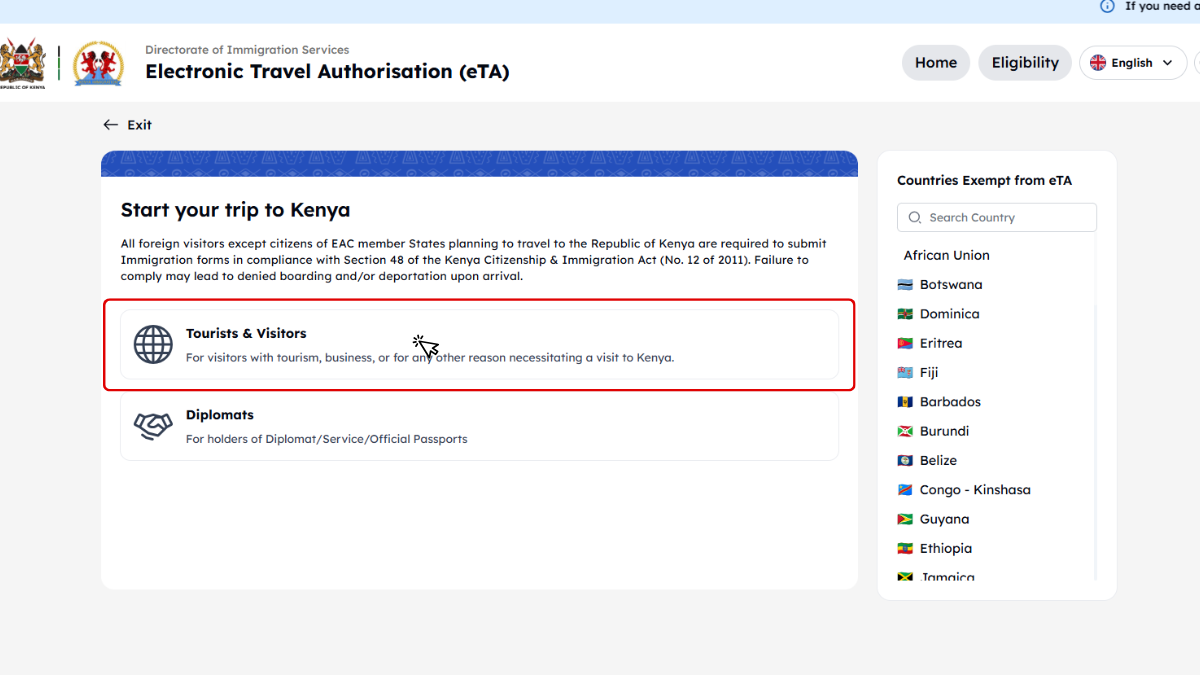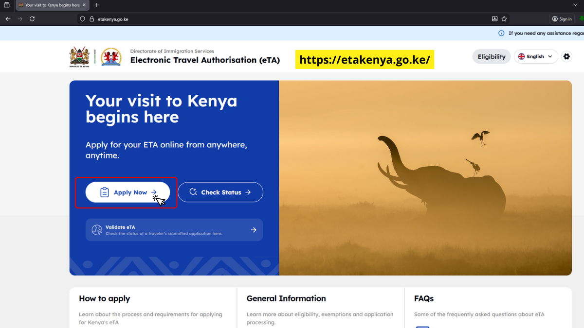Útmutatónkban, amely segítséget nyújt a Kenya eTA (elektronikus beutazási engedély) gyors és egyszerű online igényléséhez. Ebben a lépésről lépésre felépített leírásban bemutatjuk, milyen dokumentumokra lesz szüksége, hogyan tudja elindítani a kérelmet, és mire érdemes figyelni a kitöltés során. Célunk, hogy az utasok önállóan, magabiztosan és hibamentesen tudják benyújtani az eTA-kérelmet. Útmutatónk részletes példákkal és képernyőképekkel segíti a folyamat megértését és a sikeres ügyintézést.