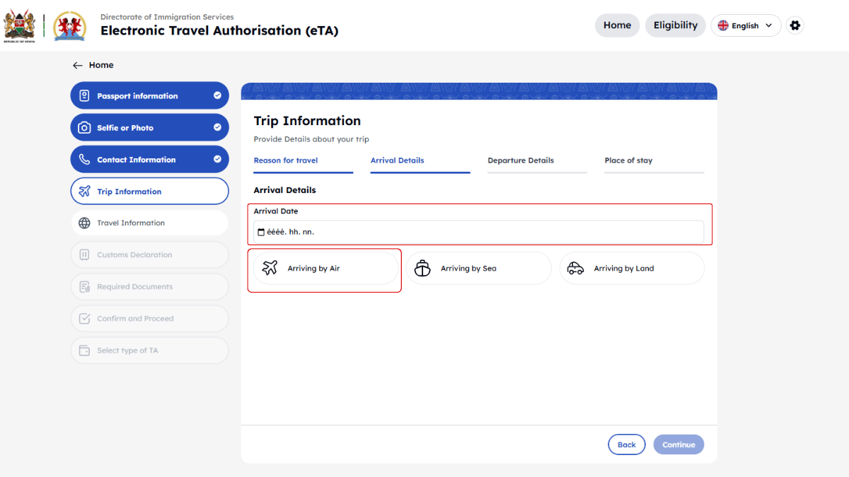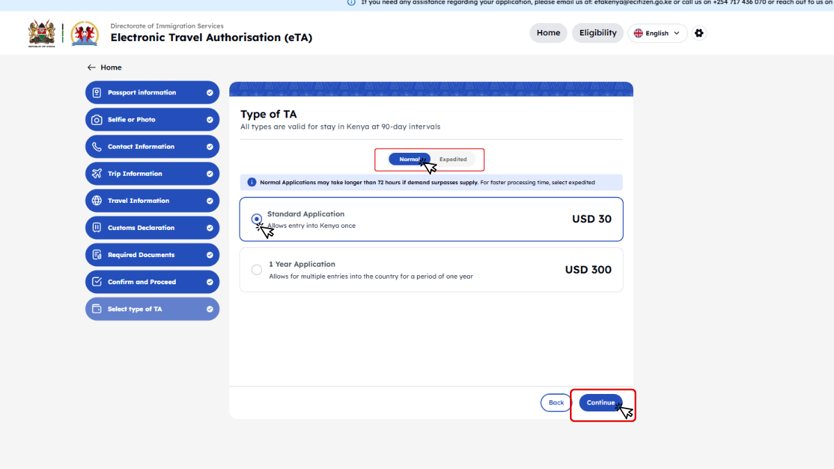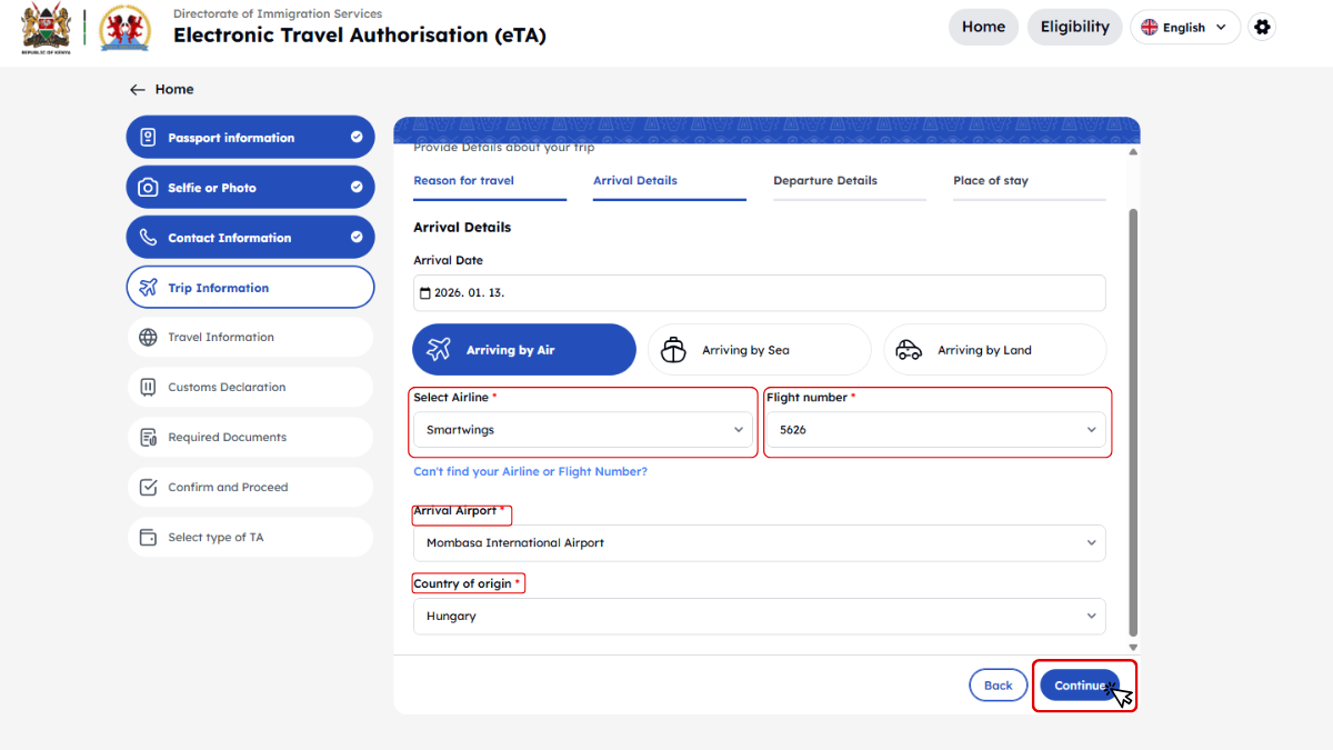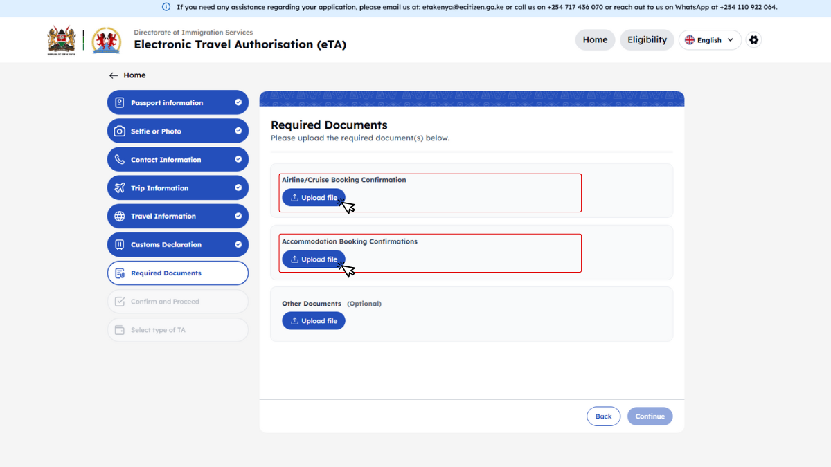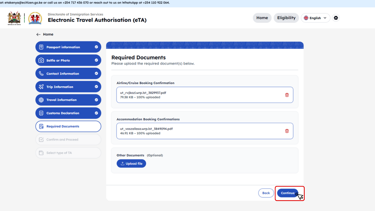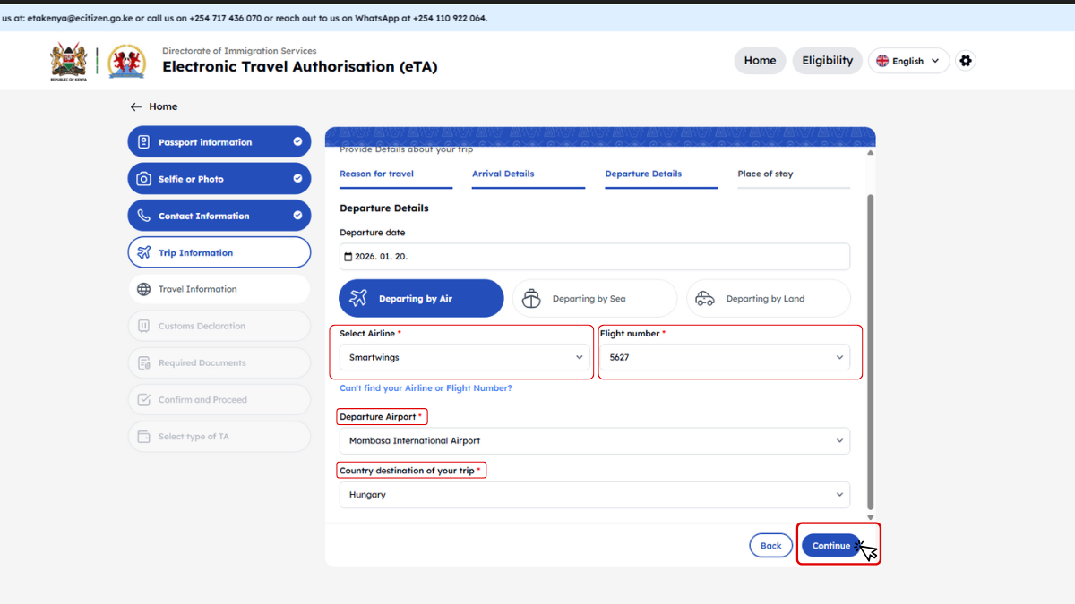 Kenya minden utazótól – beleértve a gyerekeket és csecsemőket is – megköveteli az Elektronikus Utazási Engedélyt (eTA), amelyet az utazás előtt kell online igényelni.