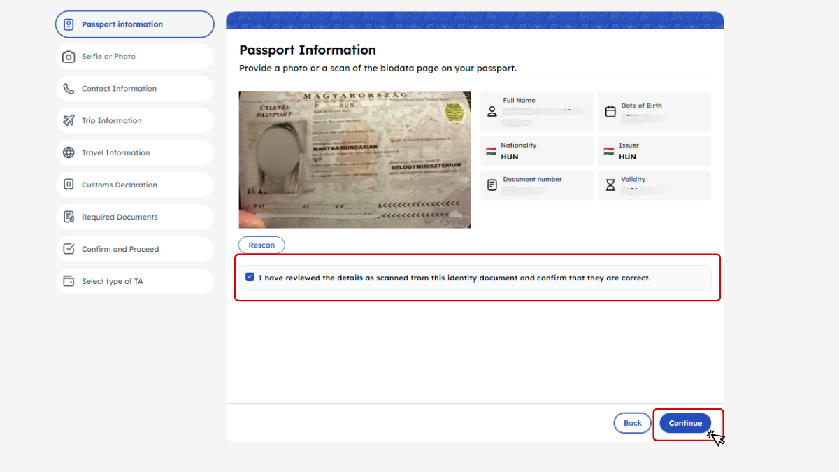 Töltsük fel az útlevél adatoldalát (PNG, JPG stb.). Ellenőrizzük, hogy a rendszer által beolvasott adatok helyesek-e.