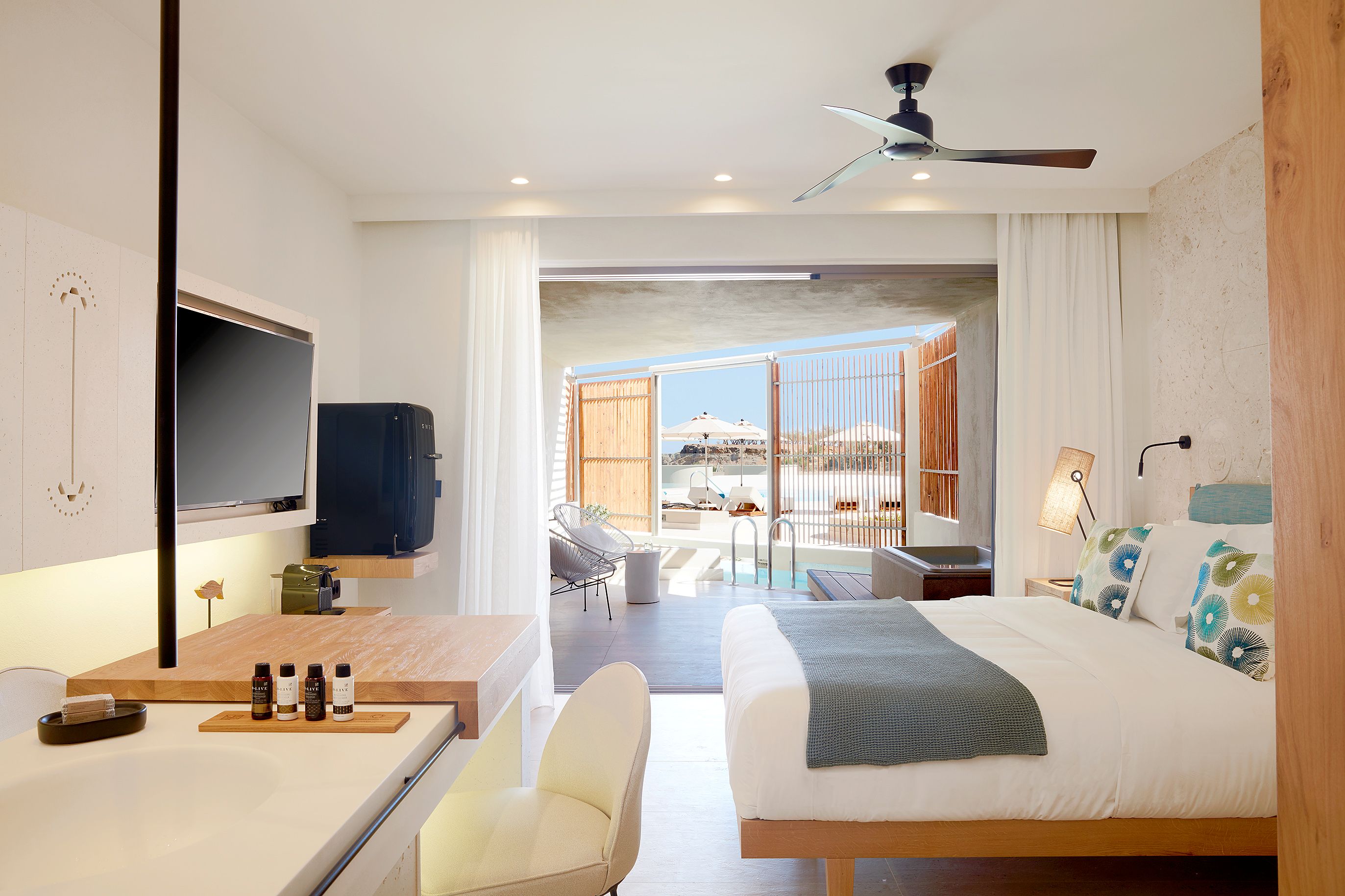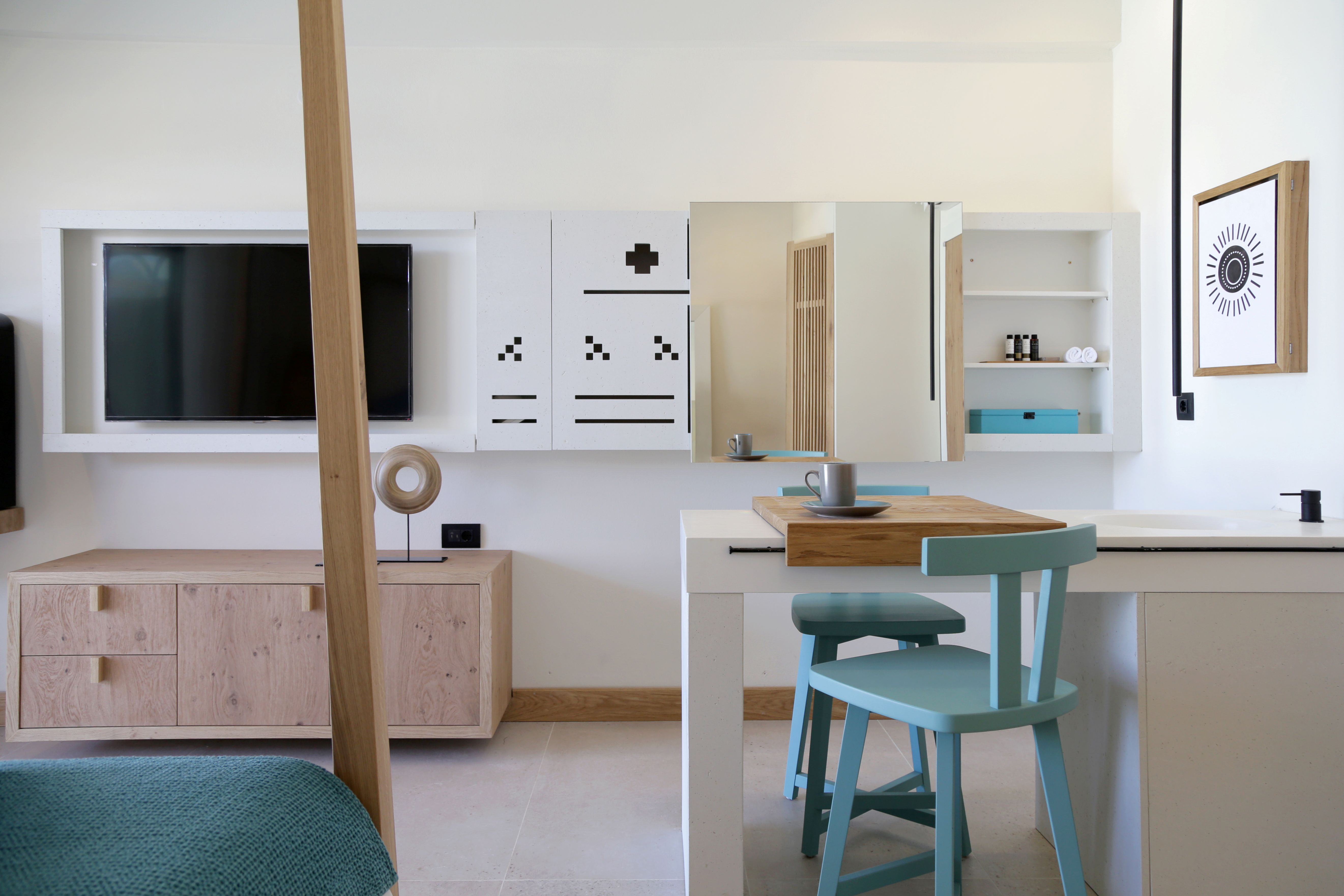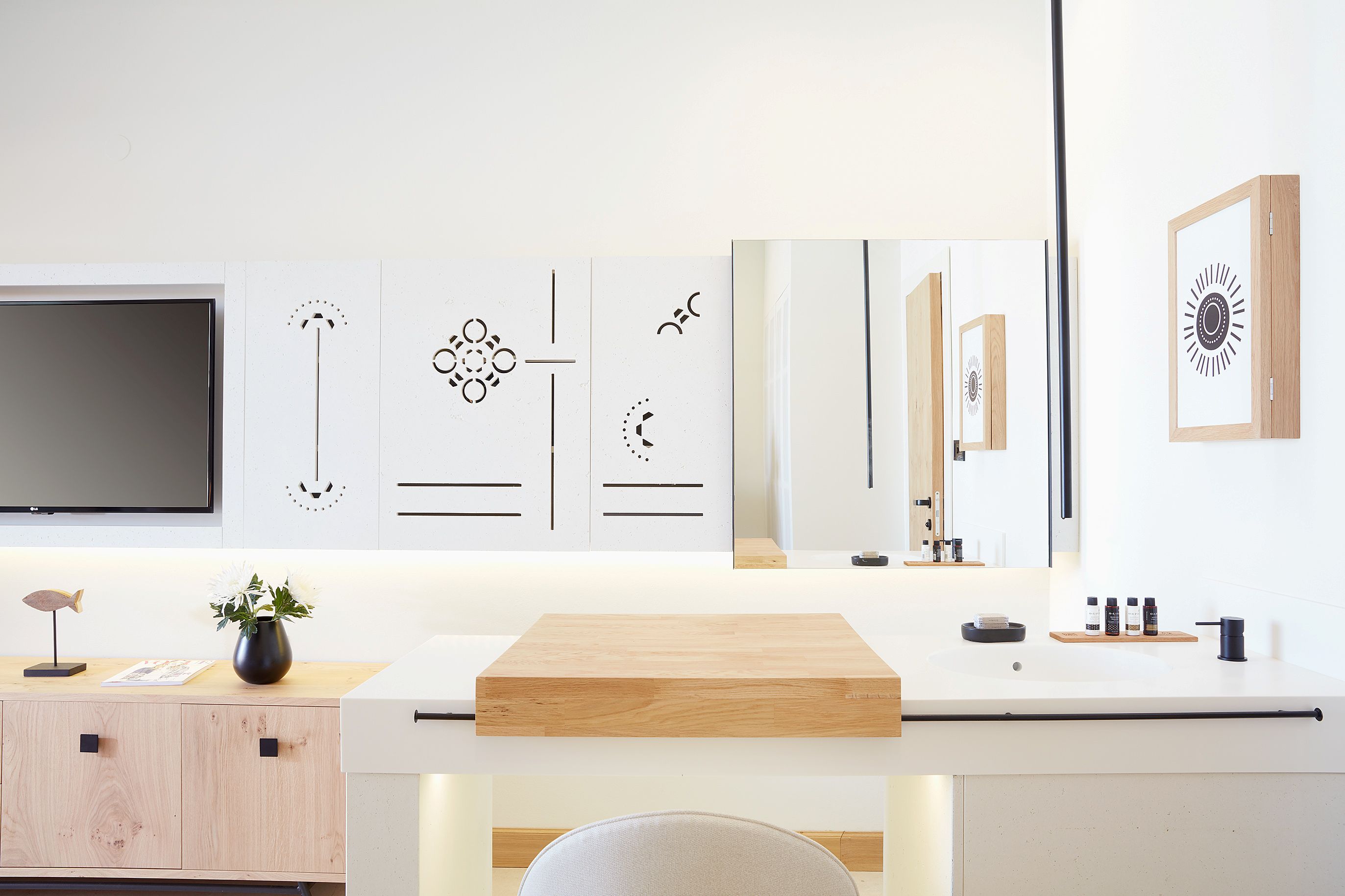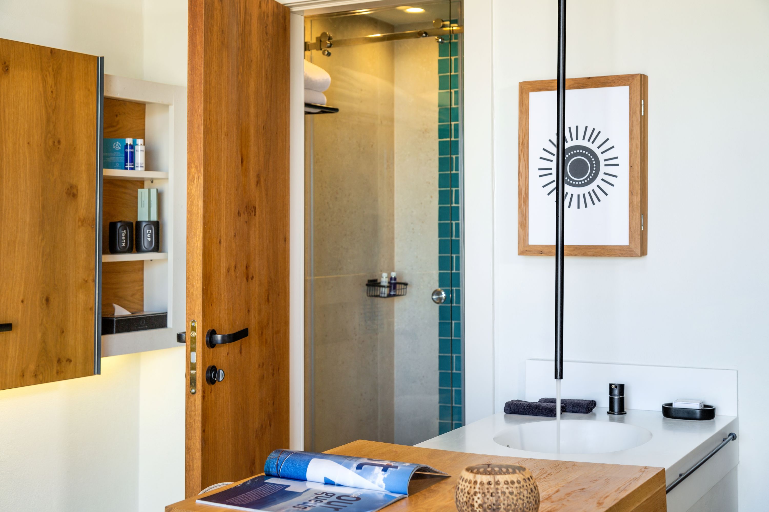 Szobáinak megjelenése megegyezik a hotel egészének koncepciójával, a természet közelsége ötvöződik a modern, minimalista elemekkel, melyet a kék árnyalatai törnek meg és helyi kézműves alkotások koronázzák meg a bámulatos összképet.
