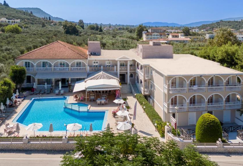 A település csendesebb részén, közvetlenül a homokos tengerparton (kb. 30 m) elhelyezkedő, egy domboldalon épűlt, fő és melléképületből álló, 4 szintes 159 szobás szállodakomplexum. A medencéhez és a tengerpartra lépcsőkön keresztül lehet eljutni. A legközelebbi buszmegálló egy kényelmes sétával (kb. 500) elérhető. A település központja kb. 1 km távolságban, ahol tavernák, bárok, kávézók, üzletek, vendéglők találhatók.