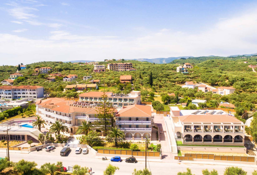 A település csendesebb részén, közvetlenül a homokos tengerparton (kb. 30 m) elhelyezkedő, egy domboldalon épűlt, fő és melléképületből álló, 4 szintes 159 szobás szállodakomplexum. A medencéhez és a tengerpartra lépcsőkön keresztül lehet eljutni. A legközelebbi buszmegálló egy kényelmes sétával (kb. 500) elérhető. A település központja kb. 1 km távolságban, ahol tavernák, bárok, kávézók, üzletek, vendéglők találhatók.